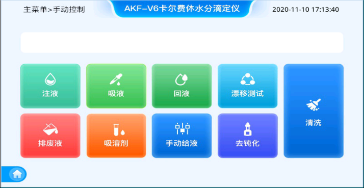 ⑧ 手動操作功能表可供用戶手動吸液、注液、回液、排廢液、電極維護、計量校正等功能;