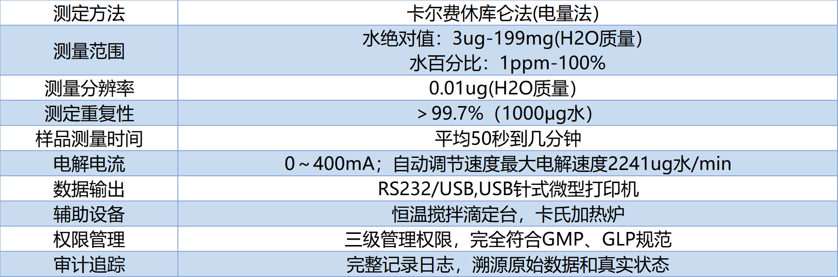 高精度 精度0.01ug,測試范圍0.001%-100%含水量 |